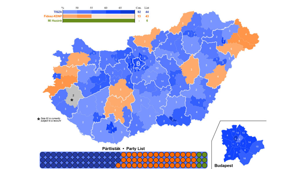 A pesar que los porcentajes generales a nivel nacional no muestran tanta diferencia entre el 53 % de Peter Magyar y Tisza con respecto al 37 % de Fidesz y Orbán, la gran brecha de escaños que el vencedor le sacó al partido de gobierno se debe al sistema mixto de asignación de cargos. De los 199 diputados a la asamblea nacional se eligen 106 en circunscripciones uninominales por mayoría simple. Allí se explica la gran diferencia lograda por Tisza en el parlamento, ya que logró la victoria en la mayoría de las circunscripciones. Los restantes 93 cargos se eligen bajo el sistema de proporcionalidad en listas nacionales, donde también gano la fuerza de Magyar pero con una brecha menor frente al oficialismo.