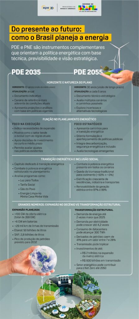 En un plano más estratégico, Brasil cuenta con un sistema de planificación energética que intenta combinar previsibilidad, base técnica y visión para el futuro. Esta política se estructura a través del Plan de Expansión Energética Decenal 2035 (PDE 2035) y el Plan Nacional de Energía 2055 (PNE 2055) como instrumentos complementarios que orientan técnicamente las decisiones públicas y privadas. El PDE trabaja con un horizonte de 10 años, con un monitoreo anual indicando necesidades de expansión, seguridad de suministro y oportunidades de inversión. El PNE adopta un horizonte de 30 años, con actualizaciones de cinco años, y evalúa múltiples escenarios para subsidiar las opciones estratégicas a largo plazo, considerando las tendencias tecnológicas, la descarbonización, la inclusión y la resiliencia del sistema.